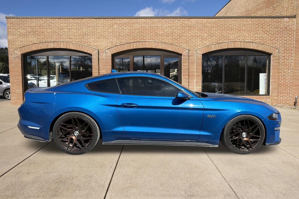Fire up our Accident Free 2021 Ford Mustang GT Premium Fastback that roars into view with a timeless Velocity Blue design and terrific performance. Powered by a 5.0 Liter V8 generating 460hp tethered to a paddle-shifted 10 Speed Automatic transmission for bold acceleration that's made even more thrilling with launch control and track-only electronic line-lock. This ferocious fastback also carves through the corners and returns nearly 24mpg on the highway. Prepare for stares even when you're parked, too, thanks to LED lighting, fog lamps, sequential turn signals, hood vents, aftermarket wheels, quad-tipped dual exhaust, and a rear diffuser and spoiler.